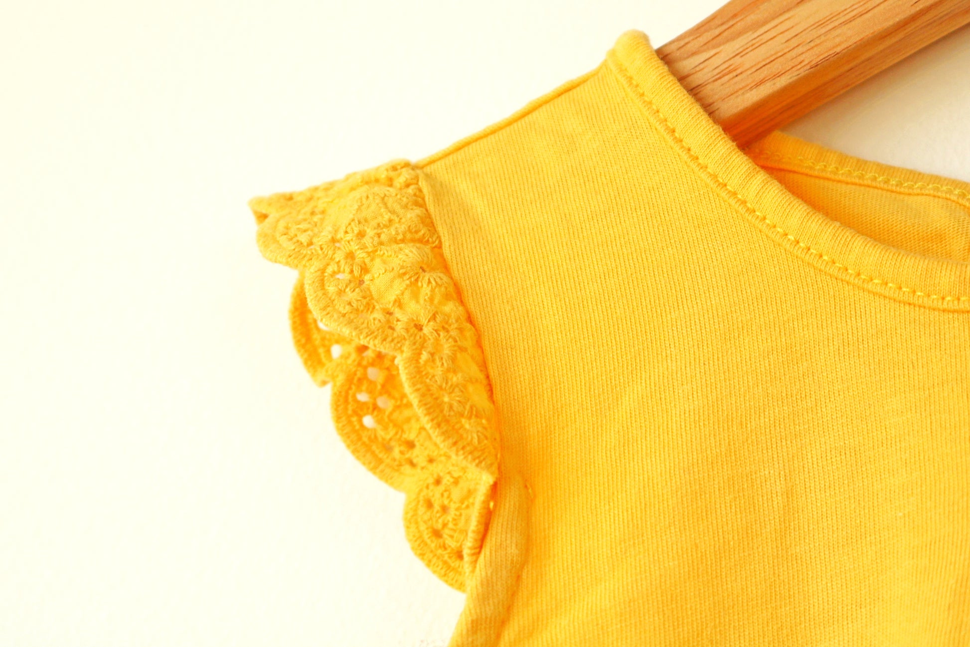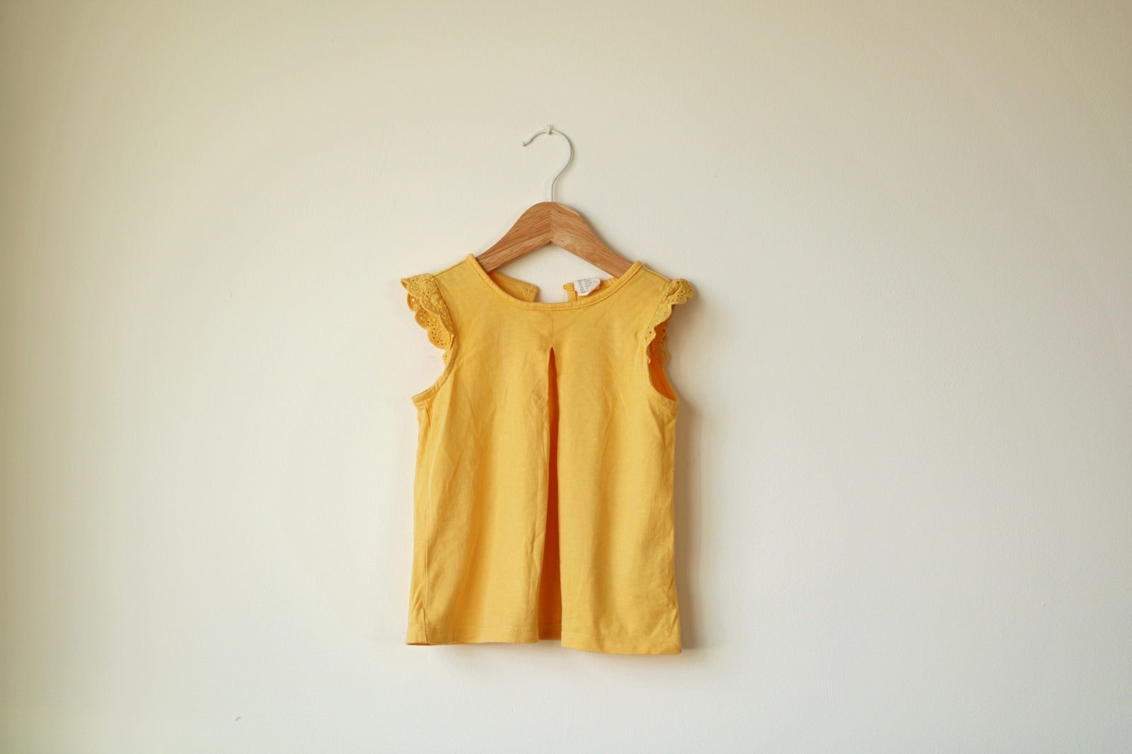 Top amarelo torrado. Franzido no peito com bordado nos ombros. Aperta atrás com um botão para vestir facilmente. Estilo Prático para o teu bebé de 18 - 24 meses (92cm) 👦🕶️