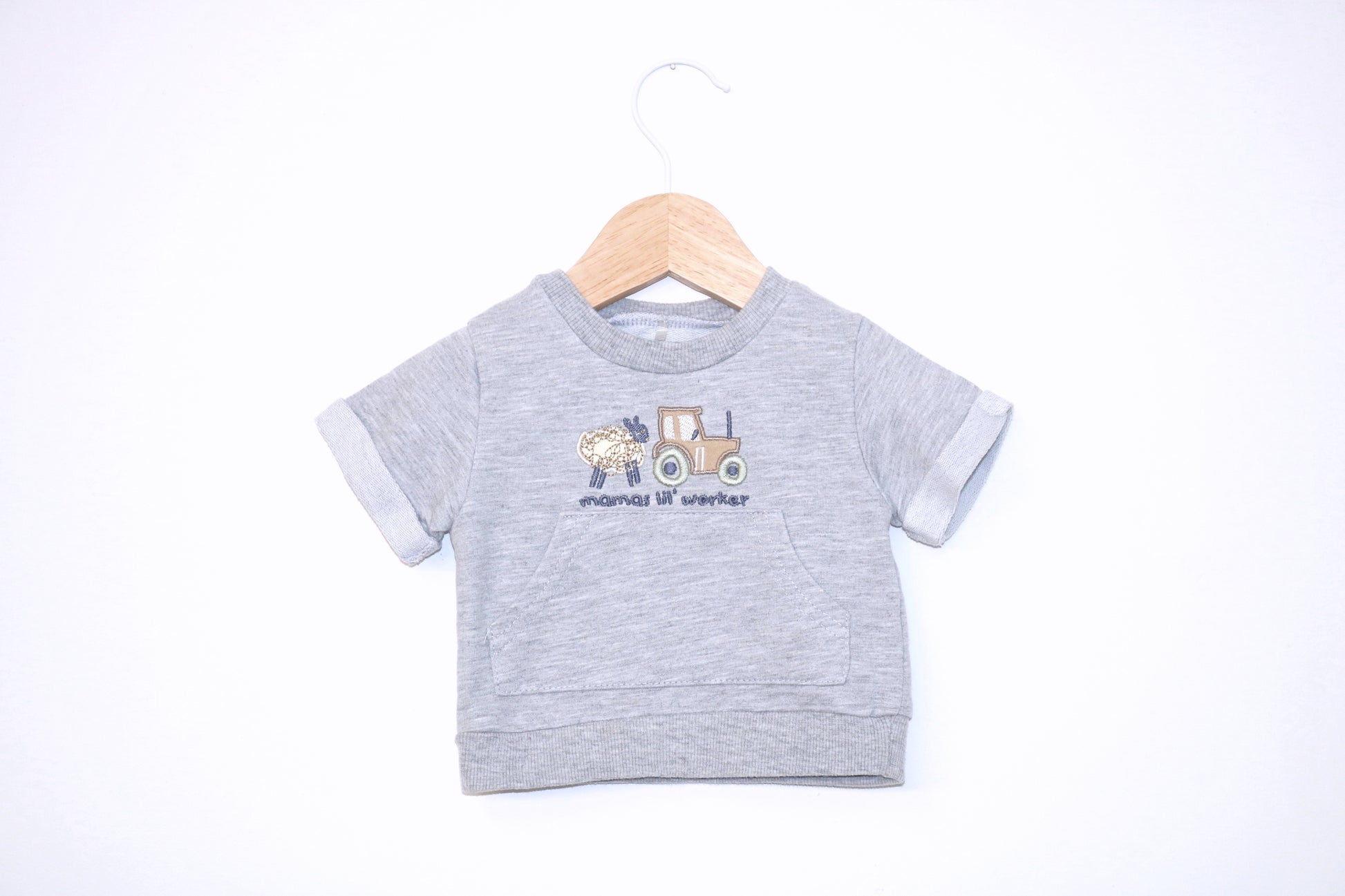 T-shirt cinzento-clara com bolso. Estilo Prático para o teu bebé de 3 - 6 meses 👦🕶️