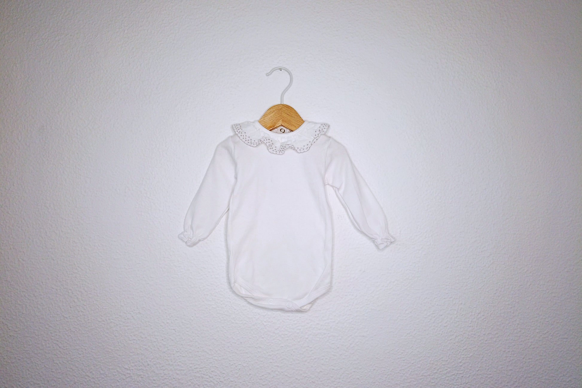Body com gola manga comprida branca. Gola com acabamento de renda. Aperta com botões de pressão na parte de trás e no entrepernas. Estilo Clássico / Prático para o teu bebé de 3 - 6 meses 👦🕶️