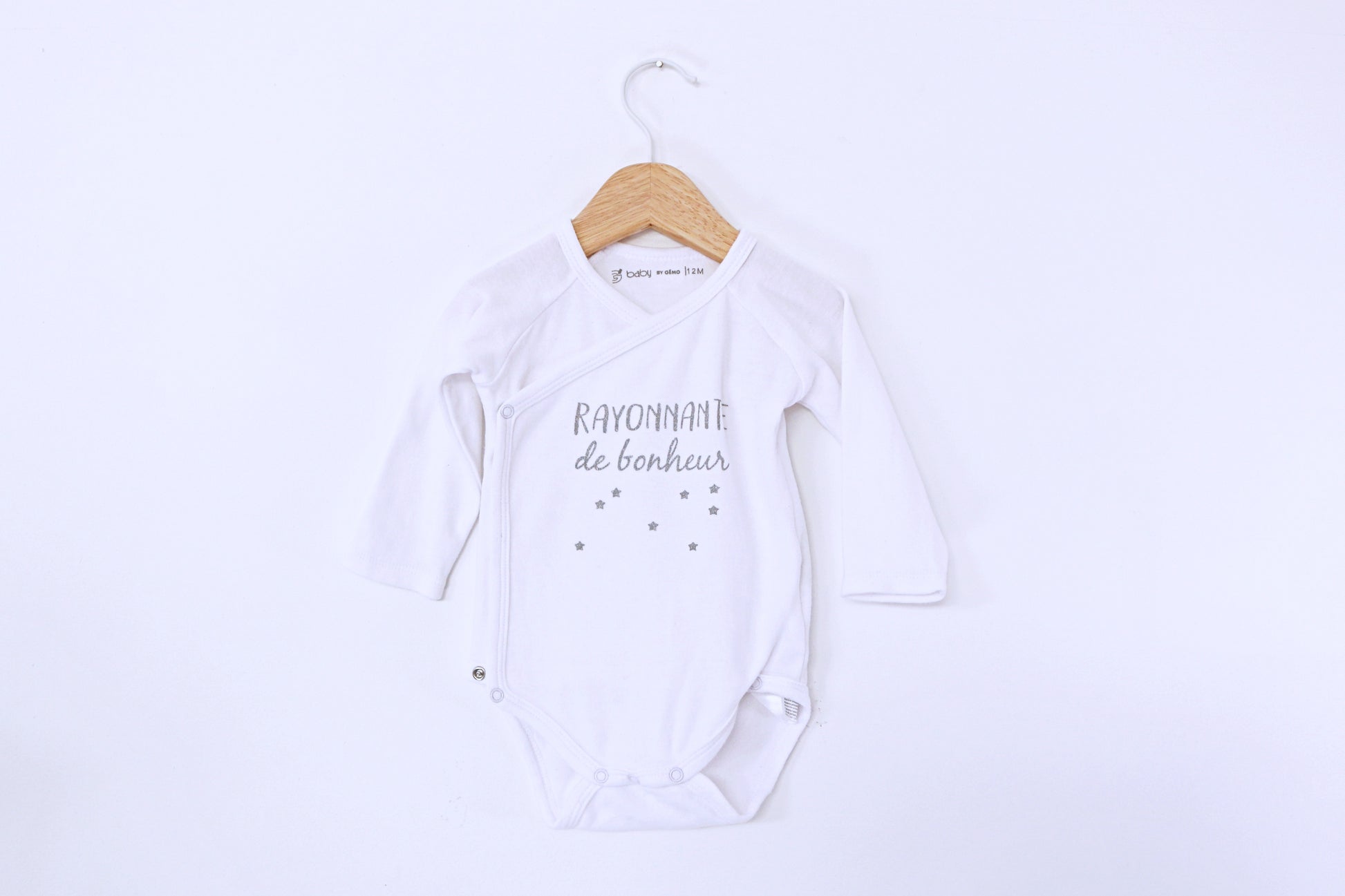 Body manga comprida branco com frase. Cruzado de manga comprida. Aperta com molas de pressão em trespasse nas laterais e no entrepernas para vestir facilmente. Estilo Prático para o teu bebé de 9 - 12 meses 👦🕶️