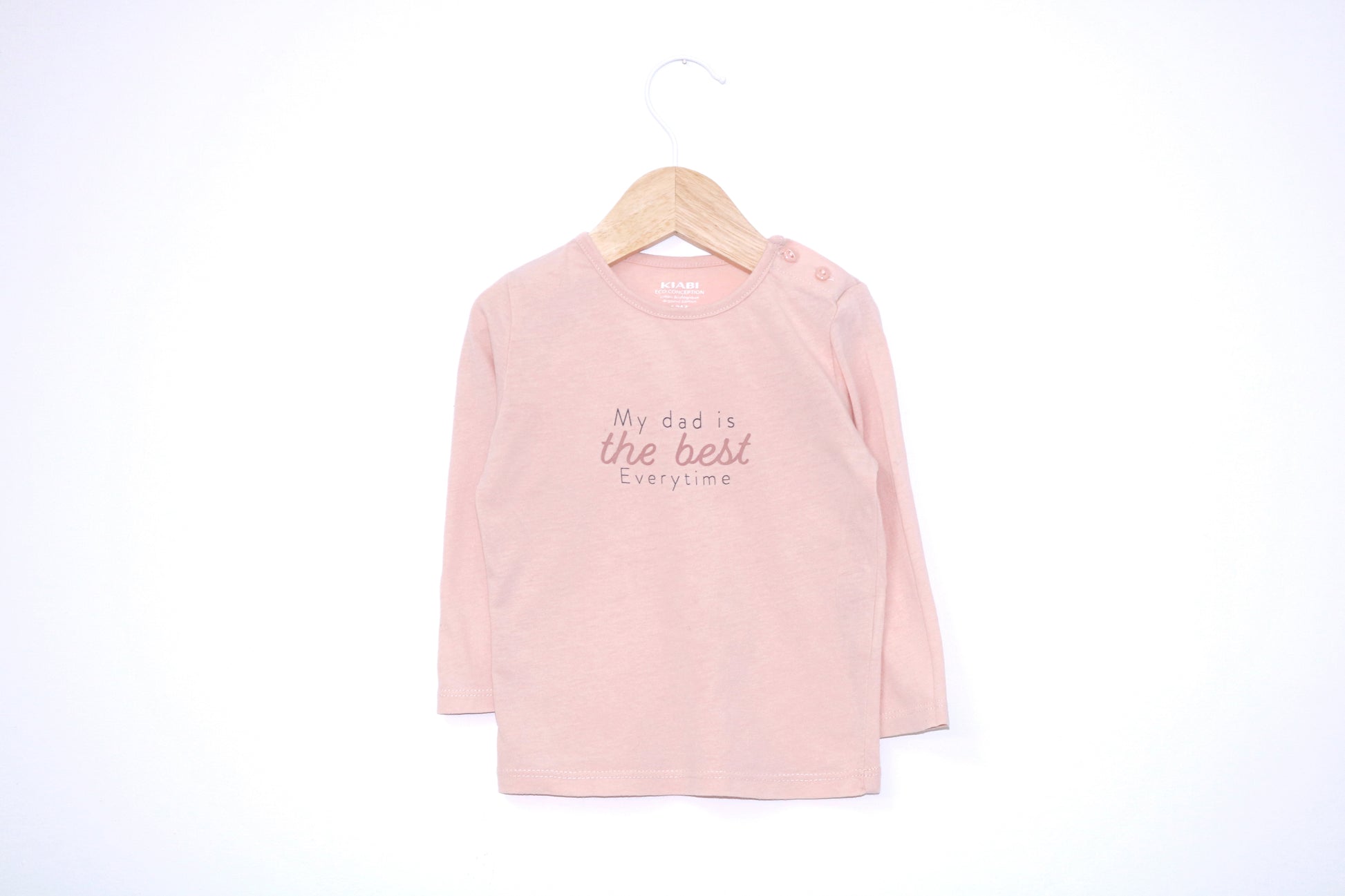 Camisola de Algodão Fina rosa-clara com frase. Aperta com botões no ombro esquerdo para facilitar o vestir. Estilo Prático para o teu bebé de 9 - 12 meses (73-76cm) 👦🕶️