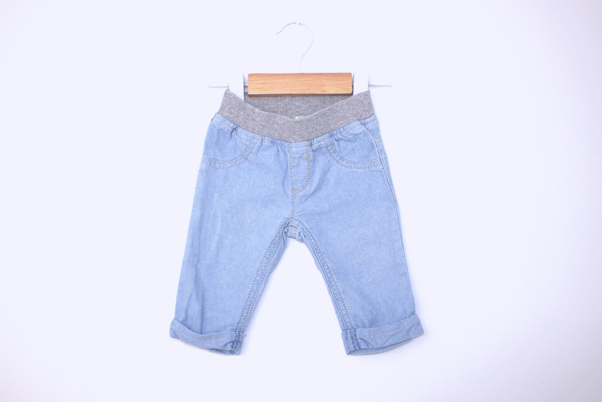 Calças de ganga (jeans) azul-claras. Estilo Prático para o teu bebé de 3 - 6 meses 👦🕶️