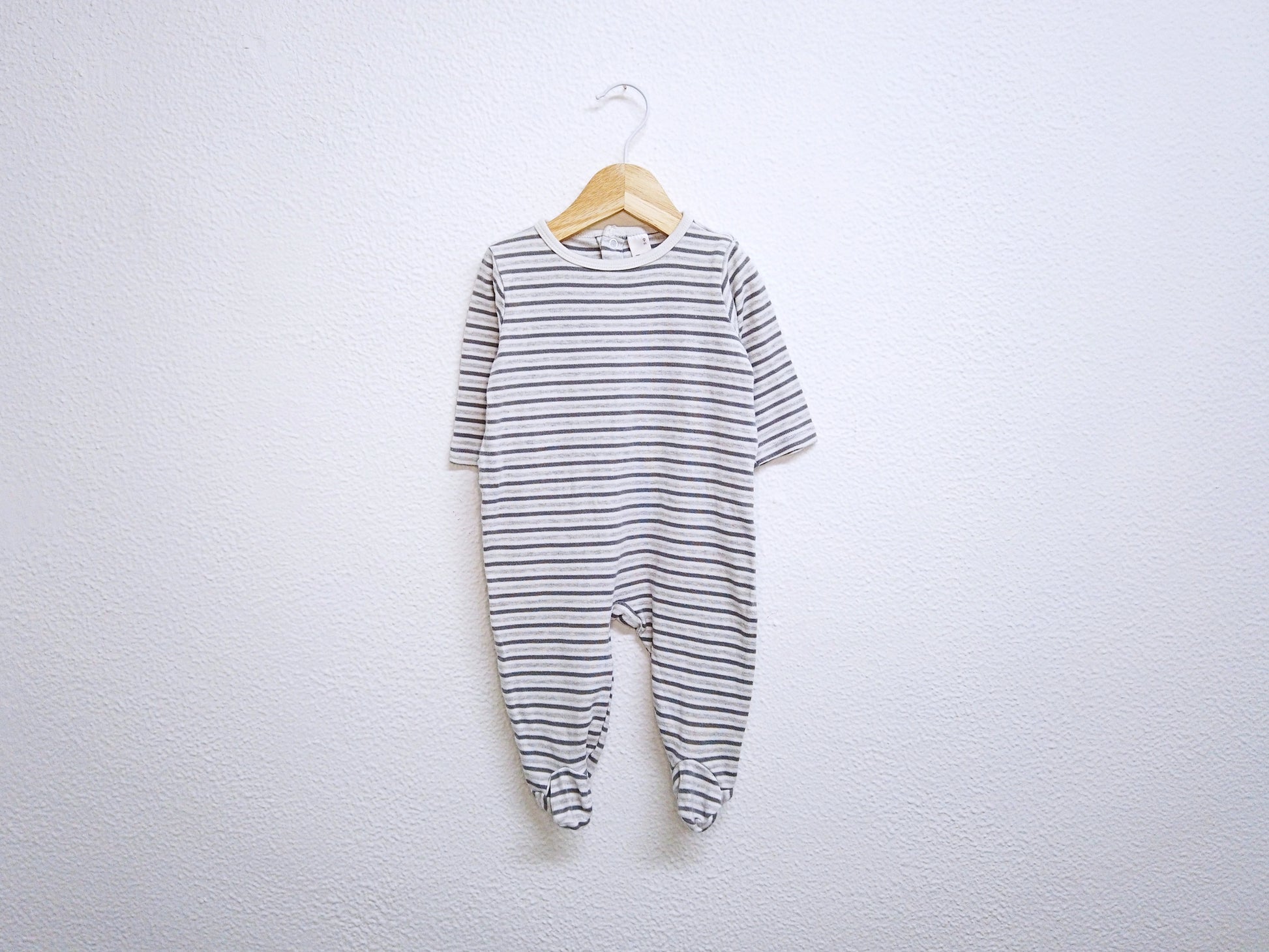 Babygrow c/ pés cinzento-claro às riscas. Estilo Prático para o teu bebé de 6 - 9 meses 👦🕶️