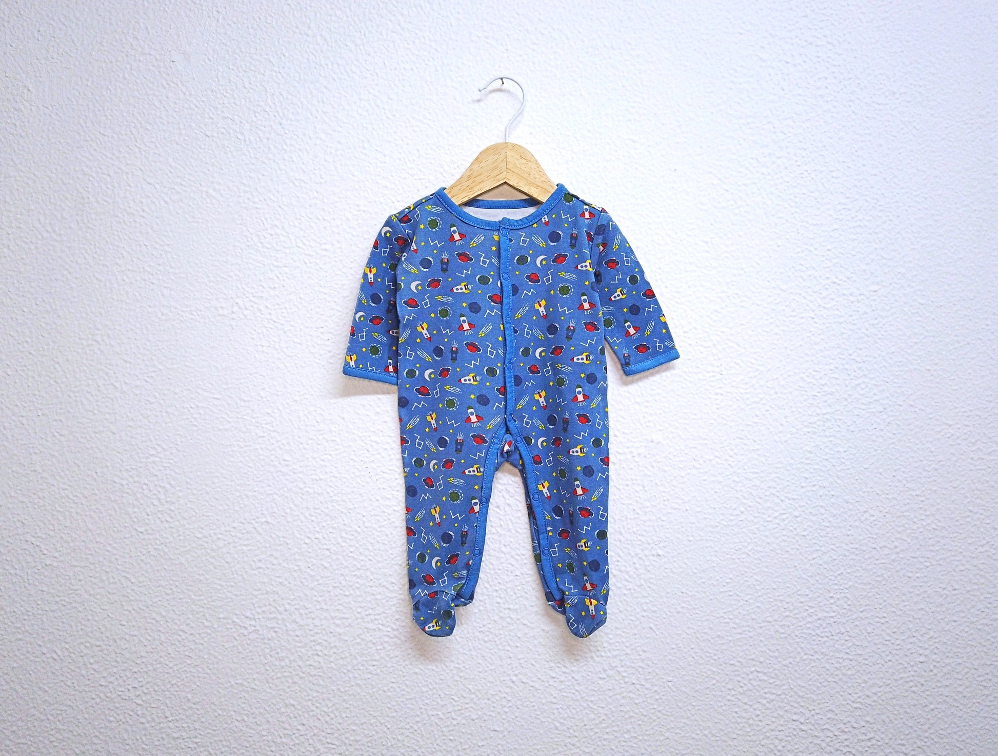 Babygrow c/ pés azul bebé. Abertura total à frente e no entrepernas com molas de pressão para facilitar o vestir e a muda da fralda. Estilo Prático para o teu bebé de 0/1 meses 👦🕶️