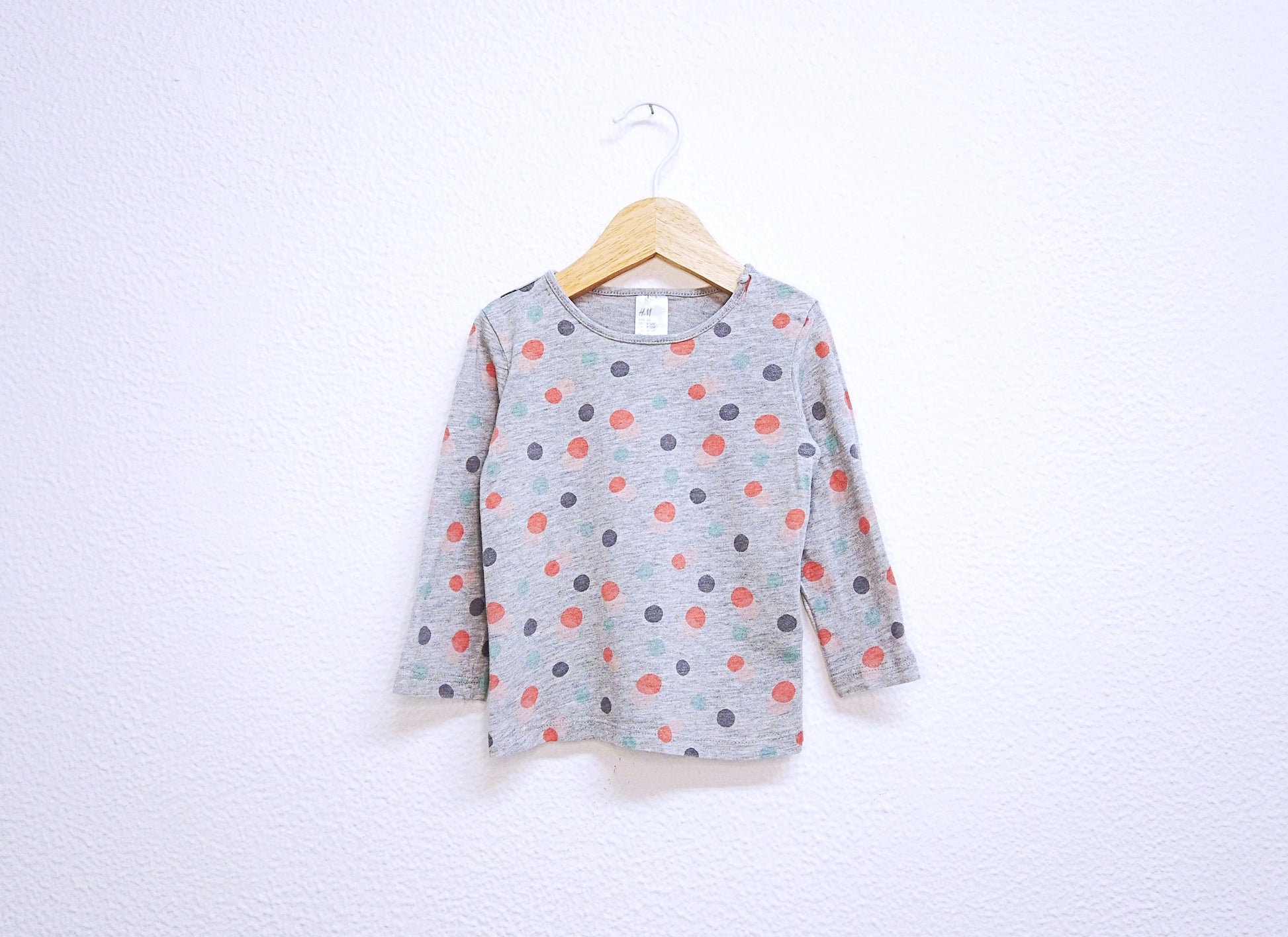 Camisola de Algodão Fina cinzento-clara com padrão bolinhas . Molas de pressão no ombro esquerdo para facilitar o vestir. Estilo Prático para o teu bebé de 9 - 12 meses (80cm) 👦🕶️