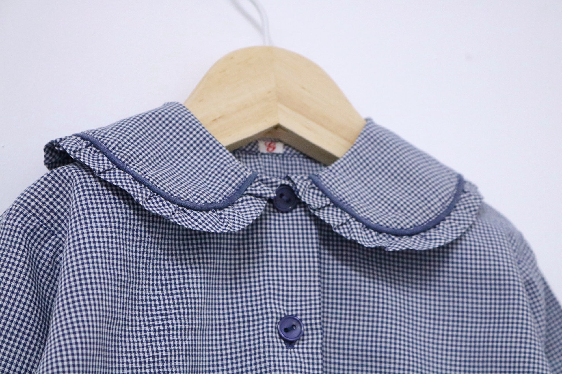 Camisa com padrão axadrezado em tons de azul-escuro. Gola de folhos. Estilo Clássico / Formal para o teu bebé de 18 - 24 meses 👦🕶️