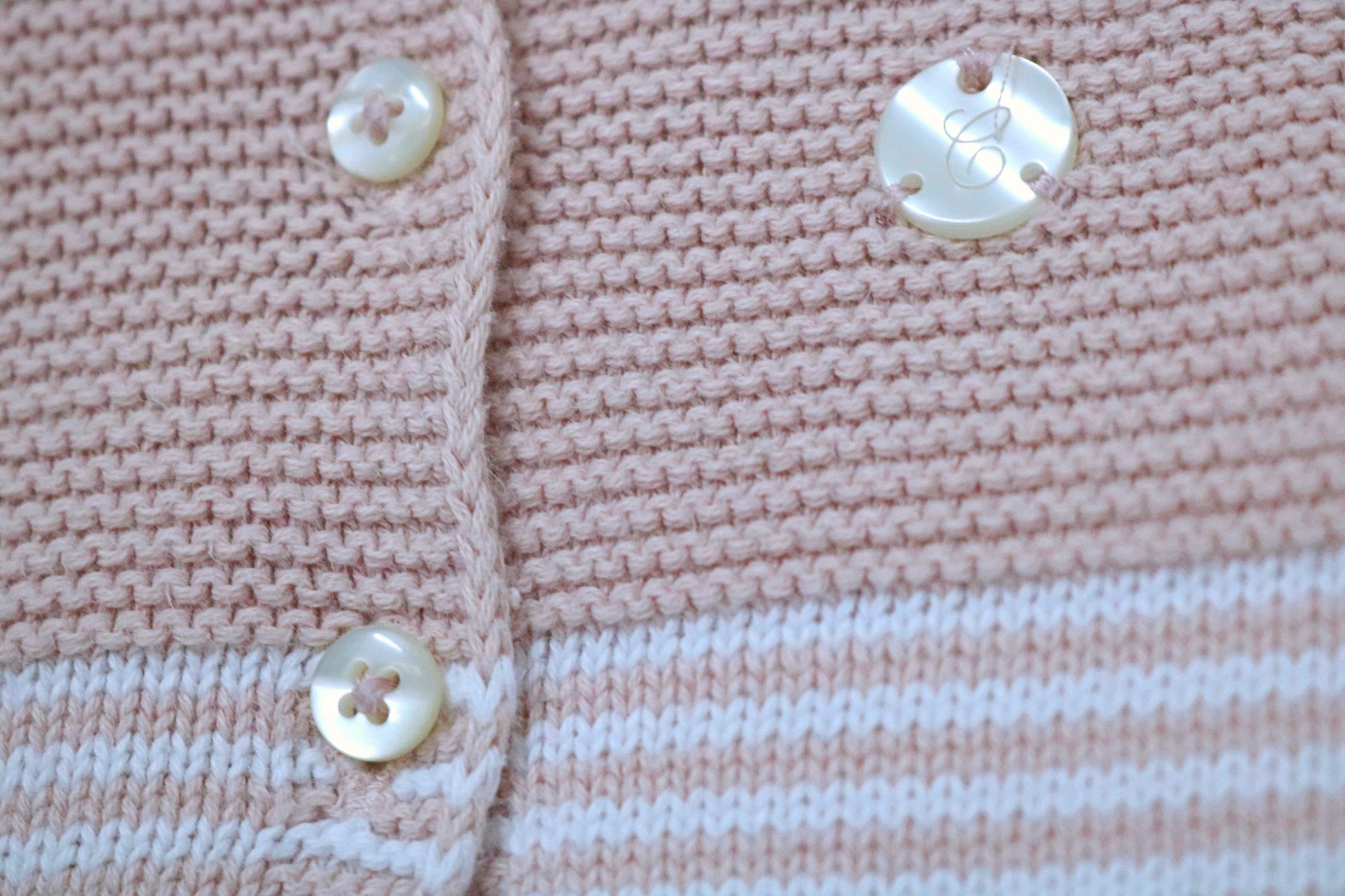 Casaco de malha rosa-claro às riscas brancas. Aperta com botões à frente. Estilo Prático para o teu bebé de 0/1 meses (50cm) 👦🕶️