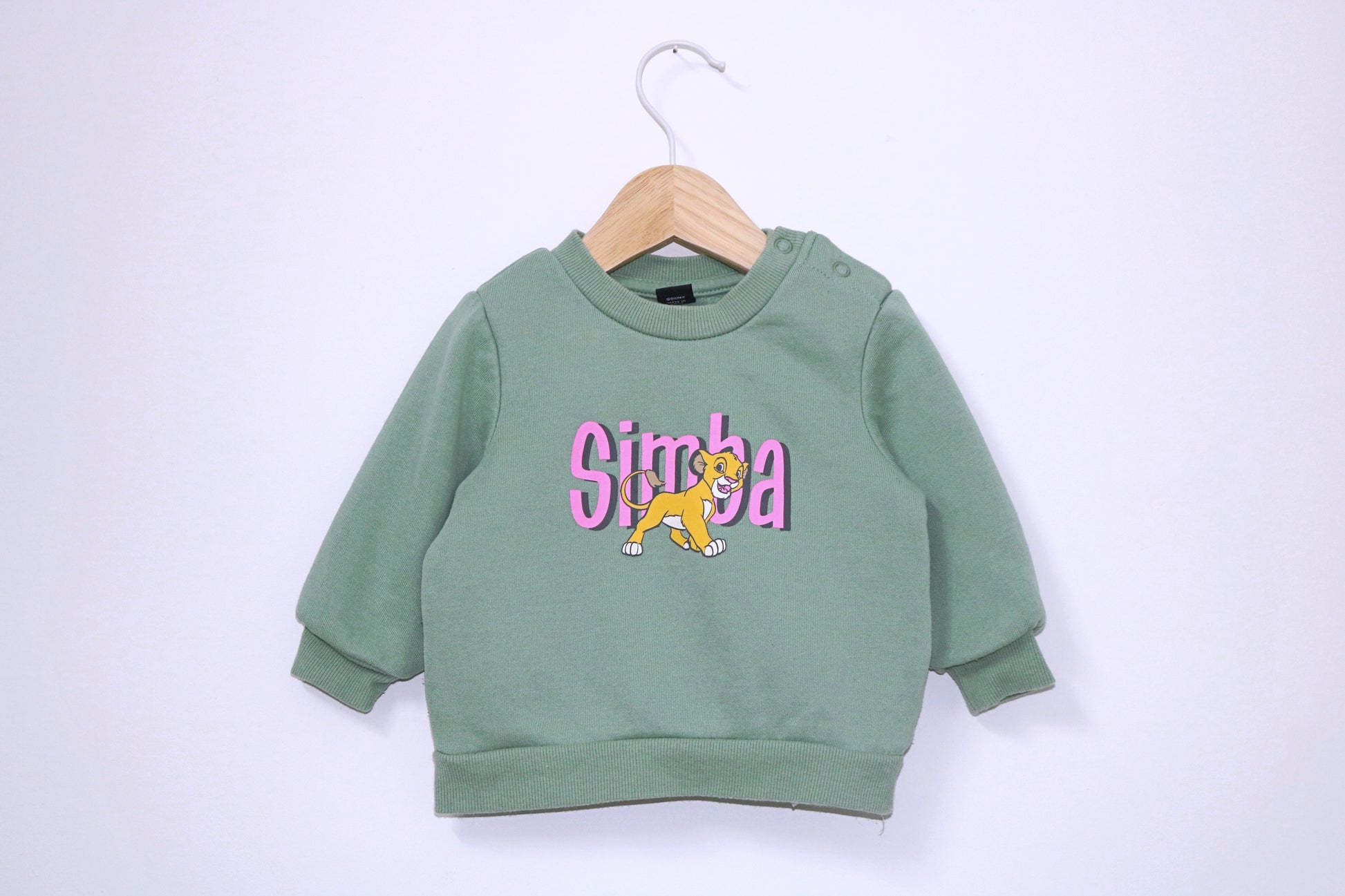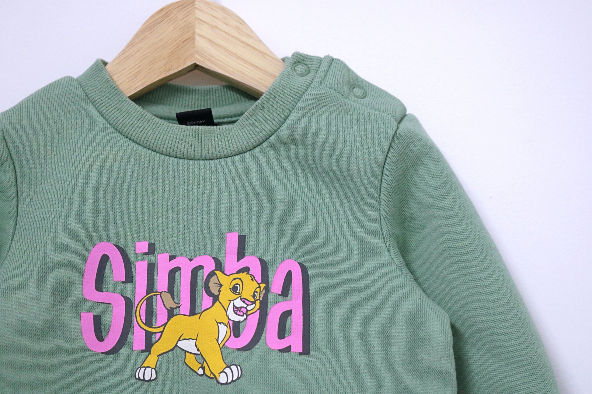 Camisola de Algodão Grossa verde com estampado frontal de bonecos. Interior polar para dias mais frios. Molas de pressão no ombro esquerdo para facilitar o vestir. Estilo Prático para o teu bebé de 6 - 9 meses (74cm) 👦🕶️
