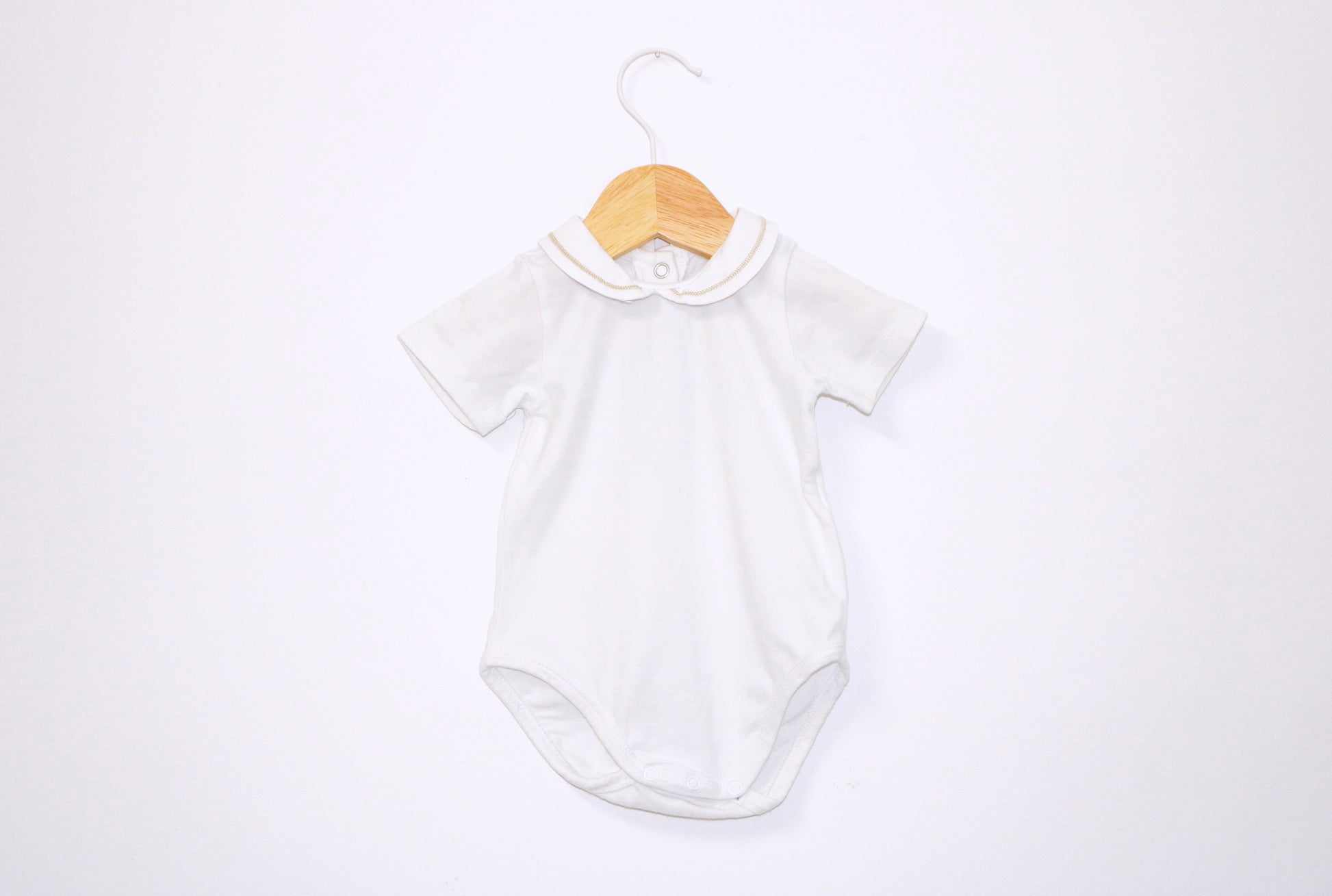 Body com gola manga curta branco com gola. Aperta com molas de pressão atrás e no entrepernas Estilo Clássico / Prático para o teu bebé de 1 - 3 meses (56cm) 👦🕶️