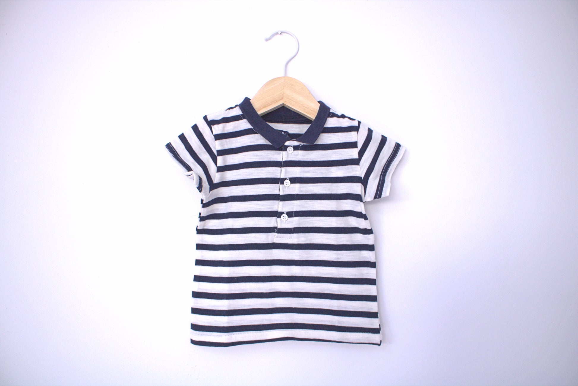 Polo azul, branco às riscas. Aperta à frente com botões em meia carcela. Estilo Clássico / Prático para o teu bebé de 9 - 12 meses (73-76cm) 👦🕶️