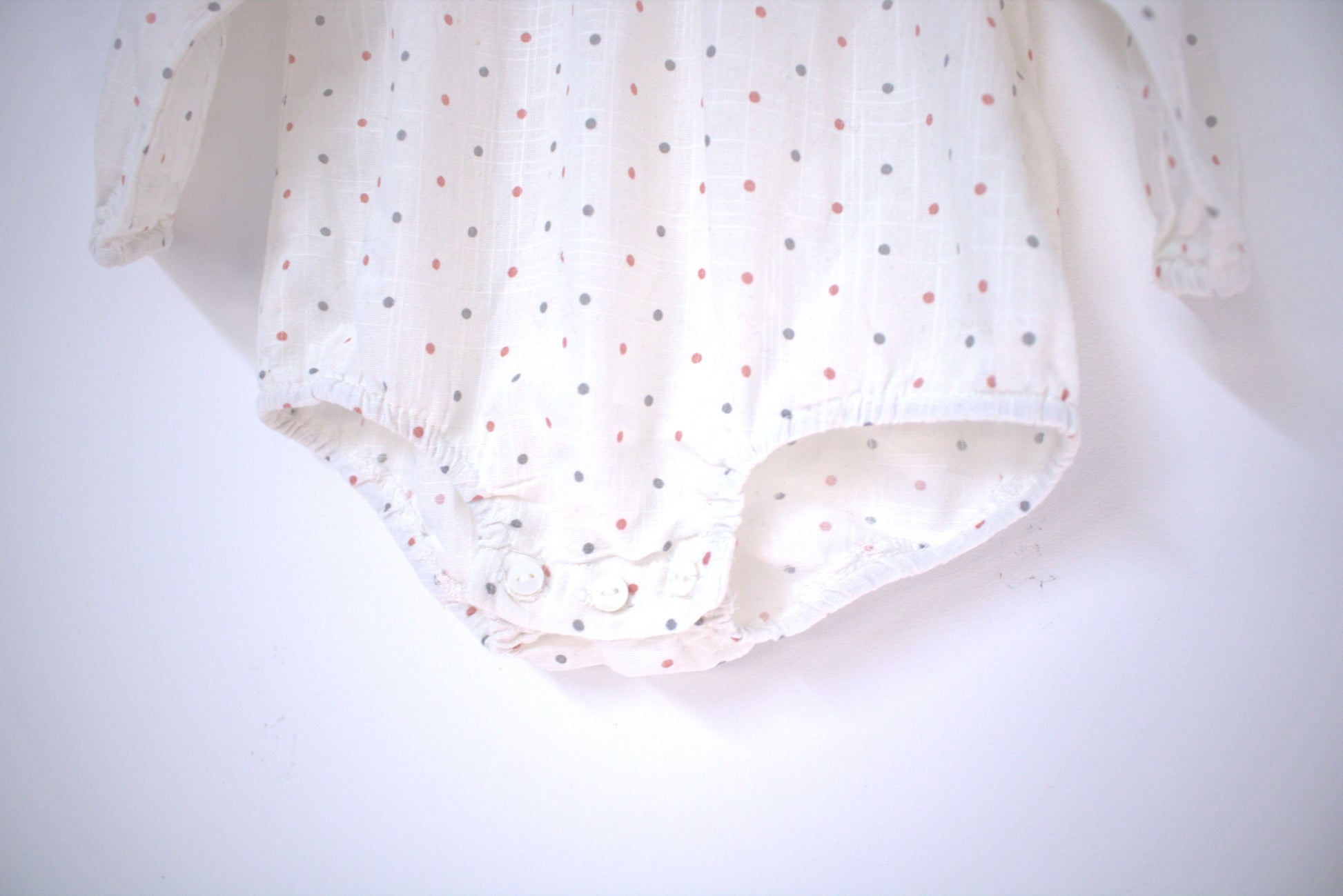 Blusa branco com padrão bolinhas . Aperta com botões atrás e no entrepernas. Estilo Clássico / Prático para o teu bebé de 1 - 3 meses (62cm) 👦🕶️