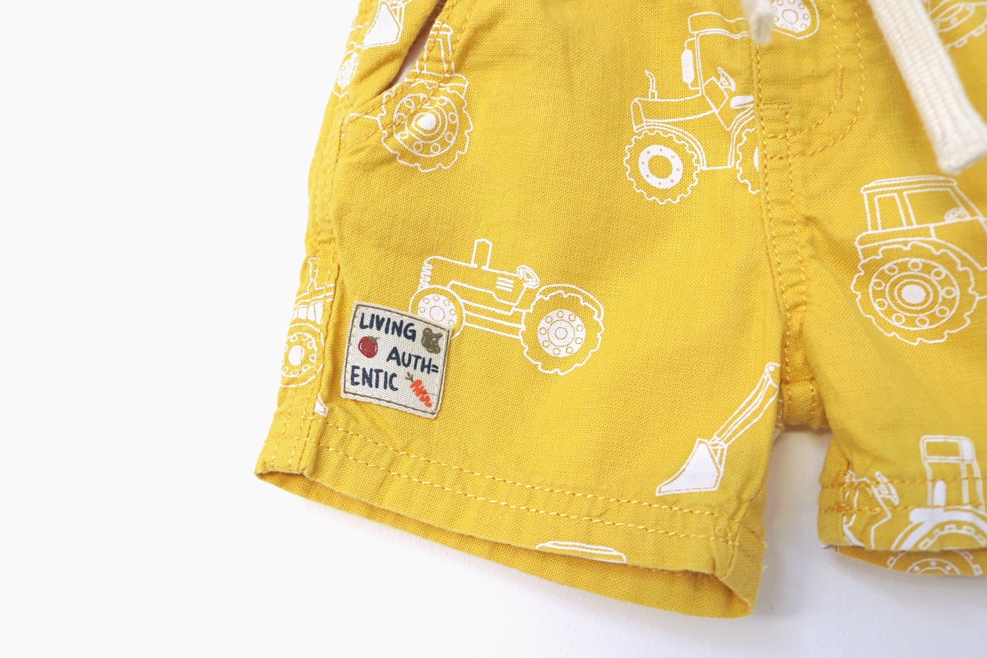 Calções amarelos com padrão tratores. Cintura elástica com cordão de ajuste. Estilo Prático para o teu bebé de 6 - 9 meses (68cm) 👦🕶️