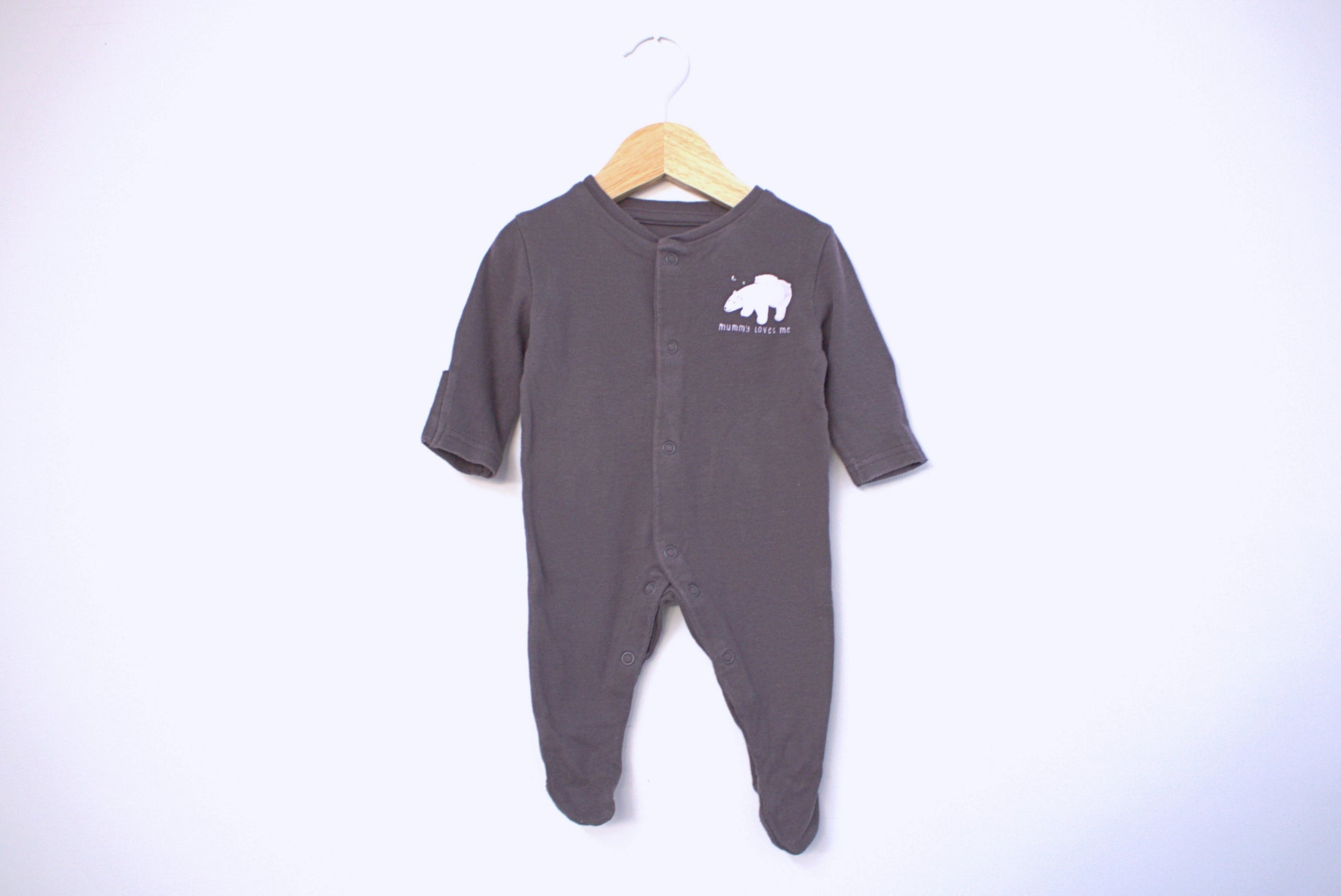 Babygrow c/ pés cinzento-escuro. Abertura total à frente e no entrepernas com molas de pressão para facilitar o vestir e a muda da fralda. Estilo Prático para o teu bebé de 0 meses 👦🕶️