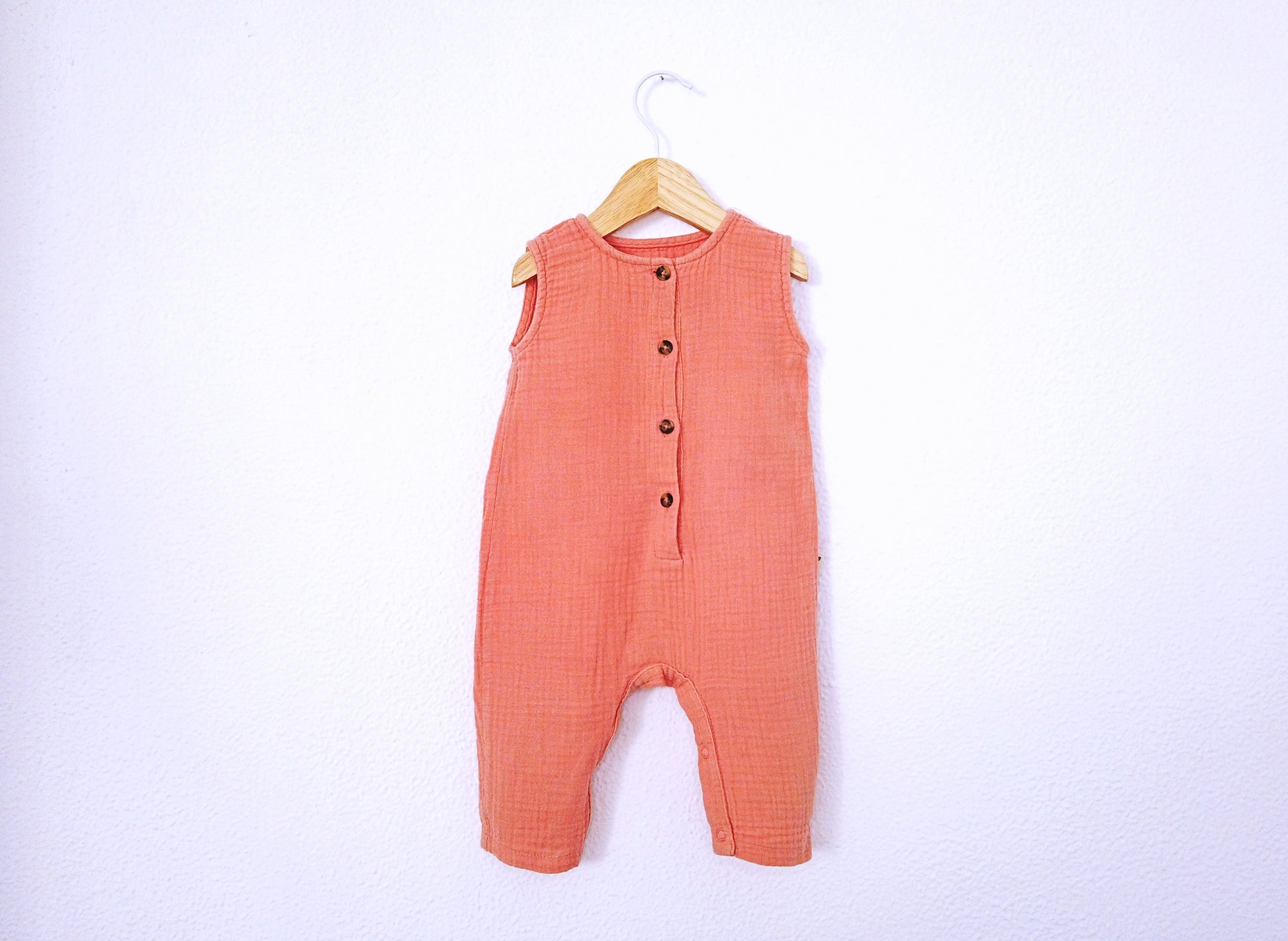 Jardineira/macacão c/pernas laranja salmão. Aperta com botões à frente e molas de pressão no entrepernas para facilitar o vestir Estilo Prático para o teu bebé de 3 - 6 meses (68cm) 👦🕶️