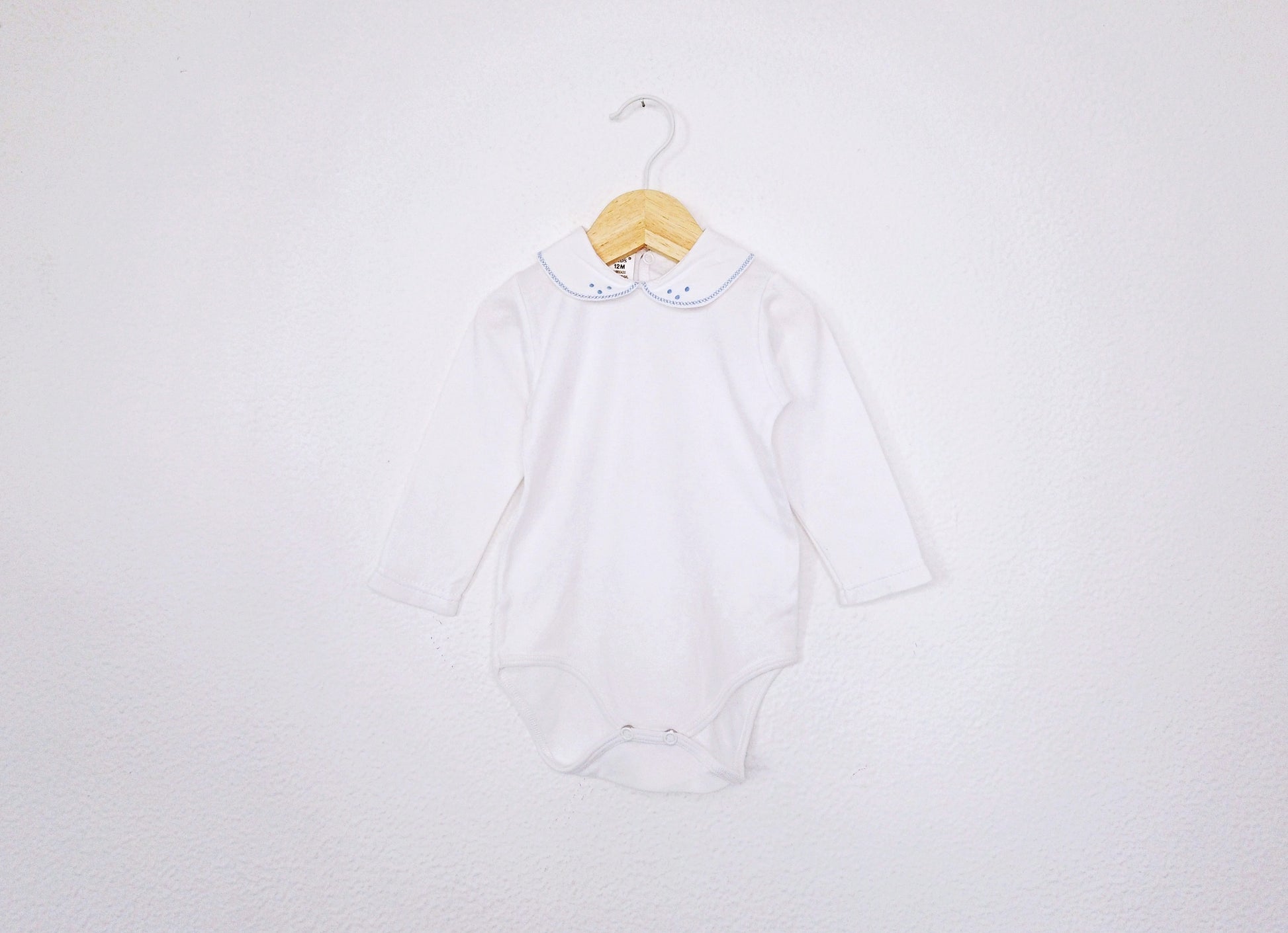 Body com gola manga comprida branco. Gola colegial. Aperta com botões de pressão na parte de trás e no entrepernas. Estilo Prático para o teu bebé de 9 - 12 meses 👦🕶️