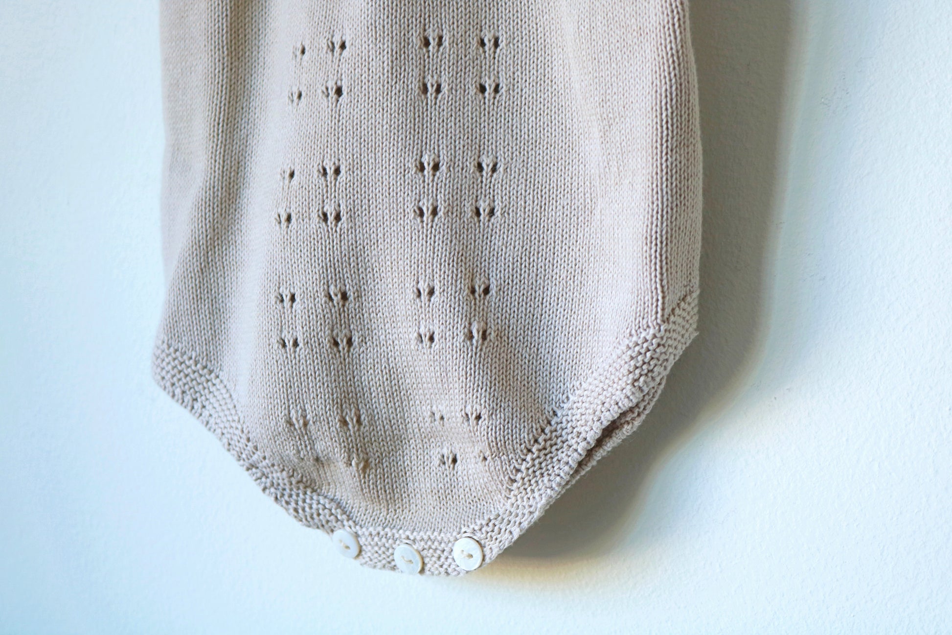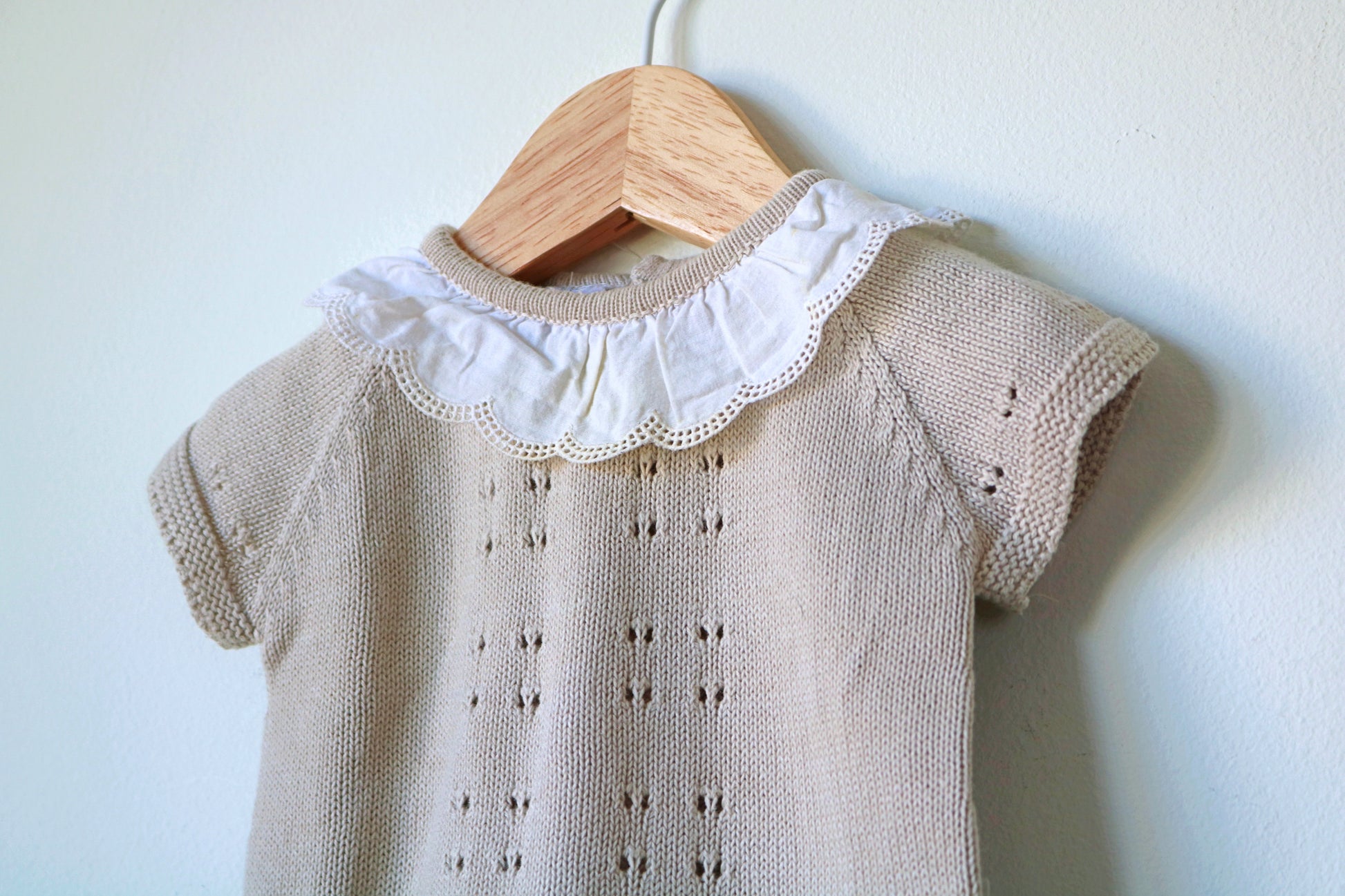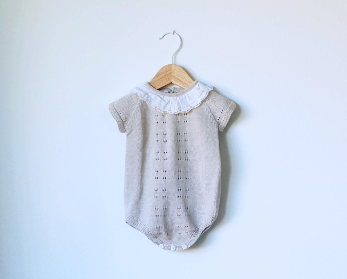 Body com gola manga curta beje. Gola de folhos. Aperta com botões de pressão na parte de trás e no entrepernas. Estilo Formal para o teu bebé de 1 - 3 meses 👦🕶️